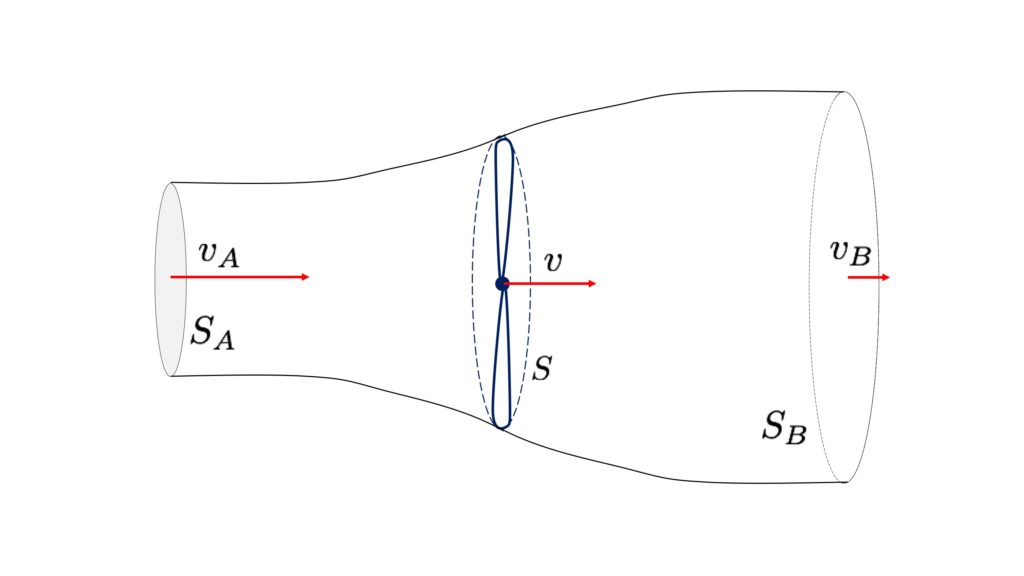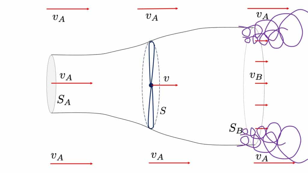 Pour saisir les marges de progression, penchons-nous sur le fonctionnement d’une éolienne. Sa surface active, c’est celle balayée par le rotor. Lorsqu’on suit le chemin de l’air à travers ce rotor, on constate que sa vitesse baisse après le passage, car l’éolienne freine le flux. Pour que le débit reste constant, la section du « tube d’air » traversé s’élargit, à l’image d’une rivière qui s’élargit lorsque son courant ralentit.