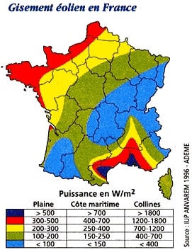 En mer, les facteurs de charge montent à 40 %. Mais pour le terrestre, une fois ce taux pris en compte, la production moyenne s’établit autour de 1 MW/km2 (et un peu moins), contre 2 MW/km2 pour les meilleurs emplacements offshore. Pour couvrir la consommation électrique annuelle de la France (500 TWh, soit 57 GW moyens), il faudrait 57 000 km2 de terres très ventées équipées d’éoliennes, soit un peu plus de 10 % du territoire national. Et si l’objectif était de satisfaire l’ensemble des besoins énergétiques, il faudrait tripler cette surface.