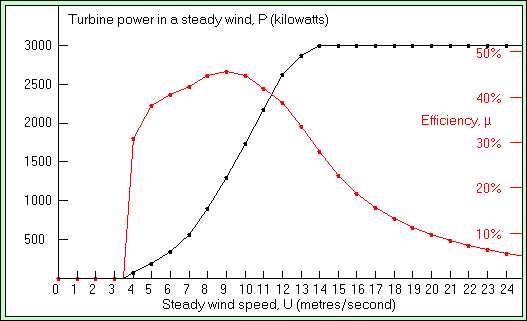 Passons à la réalité d’une machine industrielle, la Vestas V90 (3 MW). Voici la courbe de puissance produite et du rendement en fonction de la vitesse du vent :